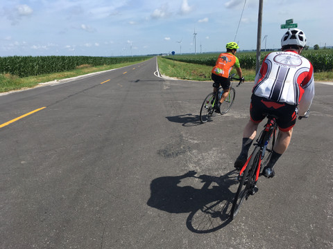 Today, at last, we have left the big hills behind us ( at least until Ohio). This made it a delight to travel over little used country roads. This is still farm country, and we shared some of the roads with farm vehicles. We had the pleasure of Mark's company today. He is part of the staff, and has seen a lot of the country by bicycle.